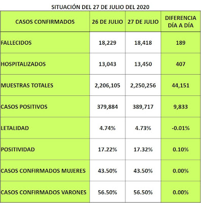 - Muestras totales: 2,250,256- Casos positivos: 389,717- Internados hospitalizados: 13,450- Pacientes en UCI: 1,424- Fallecidos: 18,418- Positividad: 17.32 %- Letalidad: 4,73 %